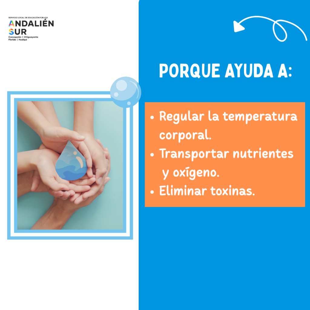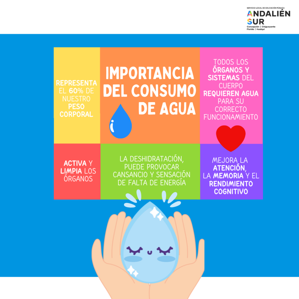 Queremos compartir con ustedes algunas recomendaciones sobre la importancia del consumo de agua, tanto en la jornada escolar como en el hogar. Mantener una adecuada hidratación es fundamental para el bienestar de todos y todas, ya que el agua es la mejor opción para nuestro organismo. Su consumo favorece la regulación de la temperatura corporal, mejora la concentración y contribuye al buen rendimiento físico e intelectual de nuestros estudiantes. Los invitamos a fomentar este hábito saludable en todo momento, priorizando el consumo de agua para cuidar la salud y apoyar el aprendizaje de nuestros niños, niñas y adolescentes.